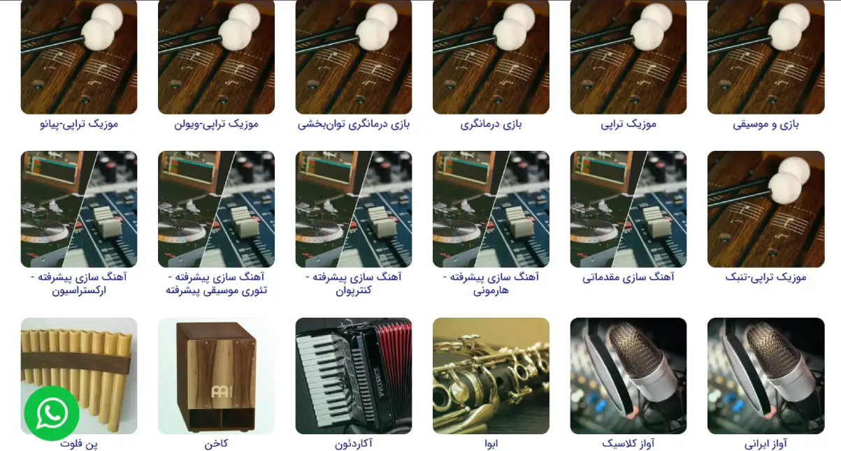 ✔ تنوع بینظیر سازها: آموزش سازهای سنتی (تار، سهتار، سنتور، دف)، سازهای بادی (نی، فلوت، کلارینت) و سازهای مدرن (گیتار، پیانو، ویولن، درامز)