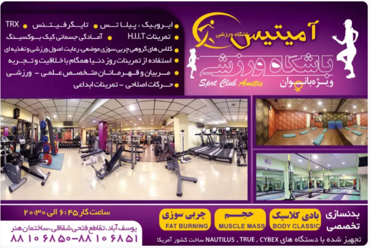 ساعت کاری باشگاه آمیتیس : ۶:۴۵ الی ۲۰:۳۰ ویژه بانوان